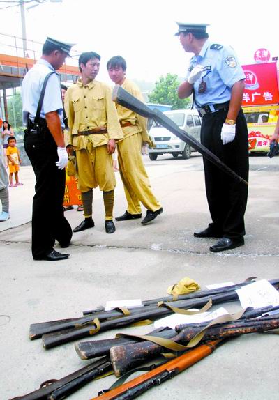 “警察来了!”突然有人叫了一声。广告车随之停下,车两旁身穿军装的人纷纷扔掉手中的“步枪”,向市场东侧跑去。未来大道派出所民警到达现场,将“日本兵”的“步枪”没收。民警称,商家使用了“步枪”、“刺刀”等仿制刀枪,给予没收。