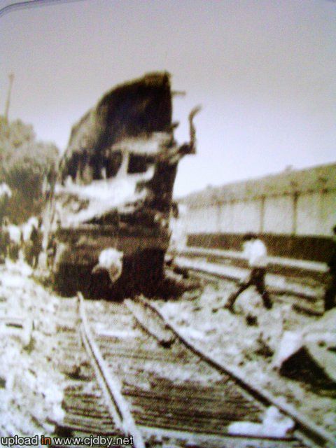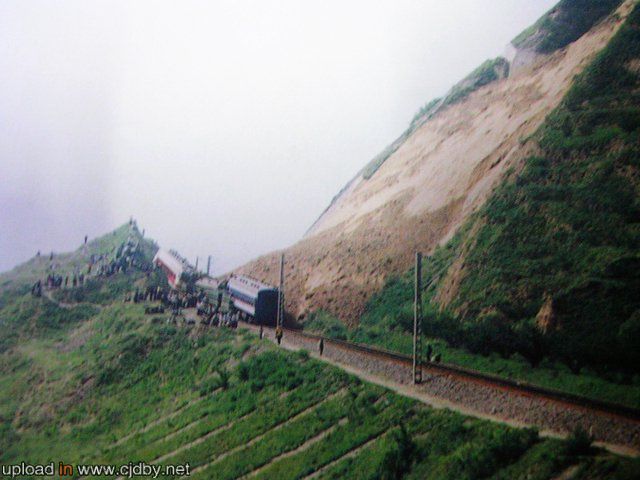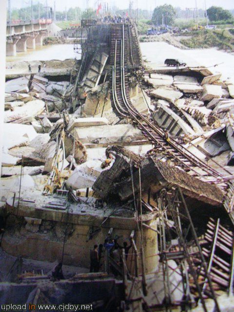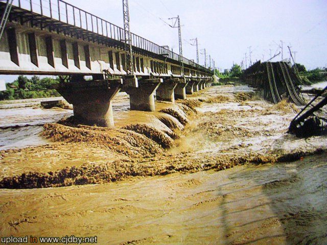 2002年夏,位于原西安铁路分局管内的灞桥被百年罕见的洪水冲踏,主要原因:当地农民采沙过限,又遇罕见洪水。图为事故现场