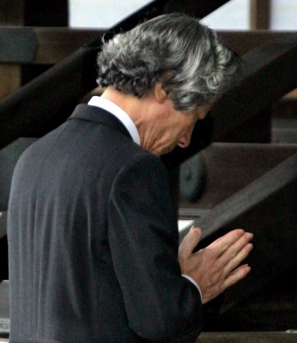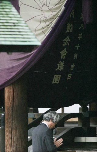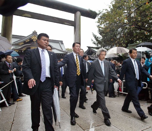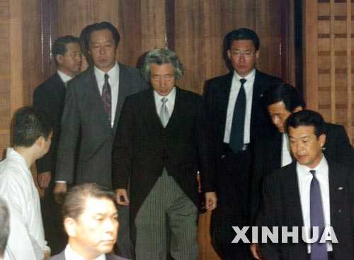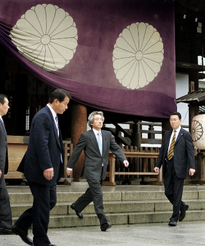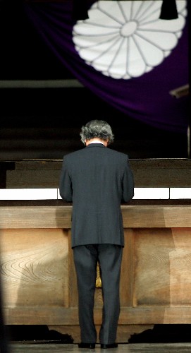 8月15日,日本首相小泉纯一郎(中)在首都东京悍然再次参拜了供奉有二战甲级战犯的靖国神社。