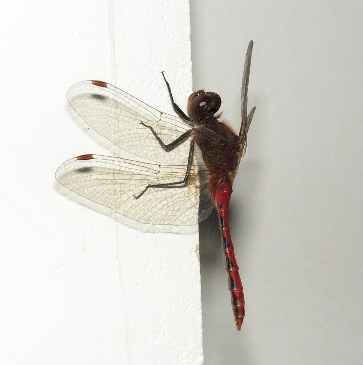 这只红色蜻蜓是晚上在地下停车场的柱子上拍的,好象在睡觉。