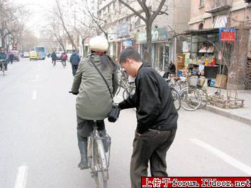 这张图片是新疆小偷们惯用的掏包方式,他们经常在人行横道线路段(因为这里骑车速度慢)三三两两的,贼眼乱转,专盯斜挎包