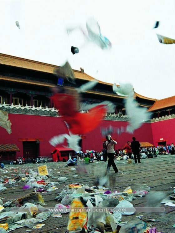 中年妇女戴着厚厚的口罩,身穿橘黄色马甲,挥舞着大扫帚在灰尘中出没;小伙子则一身学生装束,一丝不苟地清扫着每一个角落。
