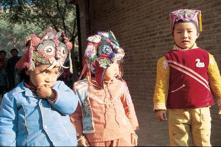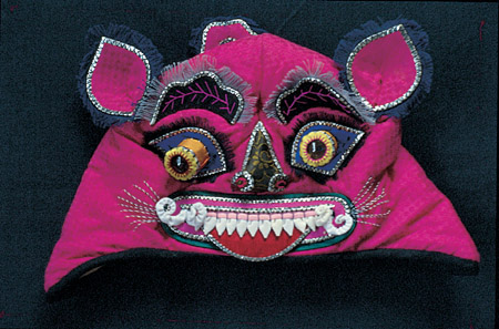 童帽,尤其重要。因为它是一身之冠首,农家妇尽其所能创造着。最主要是虎头帽,或叫狮头帽。狮虎在民间已经随着年代合而为一,它们都是百兽之王,都被视为神兽保佑着庶民。为男孩准备的帽有全虎帽、双虎帽、全狮帽、双狮帽、麒麟帽、蝴蝶扑莲帽、鱼戏莲帽等;女孩有莲花帽、金瓜帽、石榴帽、凤凰帽等,除缝绣外还缀以线穗和银铃、铜铃。日子再穷困也要根据条件,为新生儿尽力而为。