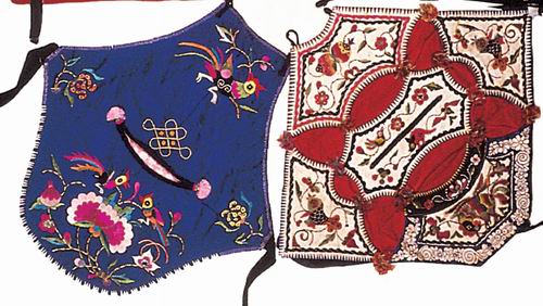 如果以肚兜作为专题,那将是美不胜收的艺术系列。特别是新婚陪嫁的刺绣品,在怀孕生育时为新生儿改制的肚兜,或是姥姥舅家为外甥制作的祝贺礼品,都是对新生命最直接的保佑与赞颂。肚兜、虎头鞋、虎头帽、虎形围嘴、各种神灵的护生耳枕和布玩具,构成了围绕生命生殖繁衍主题的配套艺术表现。也可以说是围绕新生命的成长,或者说是围绕人生三大礼仪——生、婚、丧中第一个大项目而创作,在民间艺术中形成特殊的领域,很值得继续研究。
