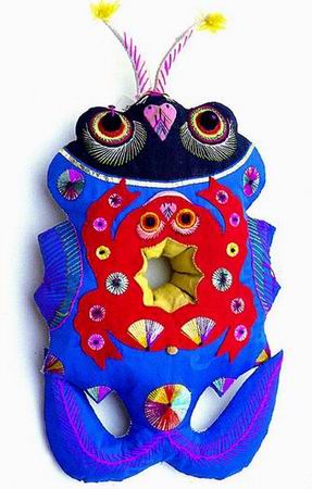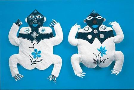我们在华阴县见到为小儿缝制的布蛙形象,十分神奇。它不同于一般蛙枕,也不同剪纸“蛙变娃”的表现,更不同五月节五毒蛙耳枕。它是用白布做底色,少量黑布衬头部,彩线勾绣五官和点缀花饰的人面蛙身。显然这又是民间的意念造型,不求物体对象的自然真实性,而取其观念的合理性。蛙对民间庶民说来就是娃,就是祖先规定的古老的生殖之神。蛙、人结合是明确的点题,如同人头虎身布老虎、人鱼合体等一样的构思,是先民传下来的人兽合体,是作为神灵崇拜的遗训。人头蛙无疑是新娘的陪嫁物,是希望的寄托也是性启发和胎教的依据,当然更是陪伴新生儿玩耍的保护神灵。