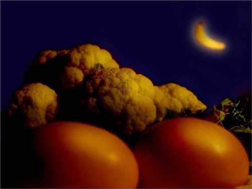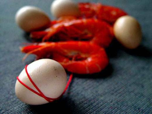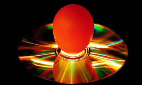 在鸡蛋下面加光源,经长时间曝光,使鸡蛋呈半透明状态;同时用光源对光盘打光,使其呈现出变换的色彩。