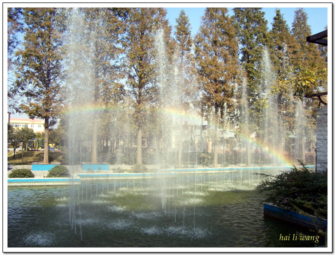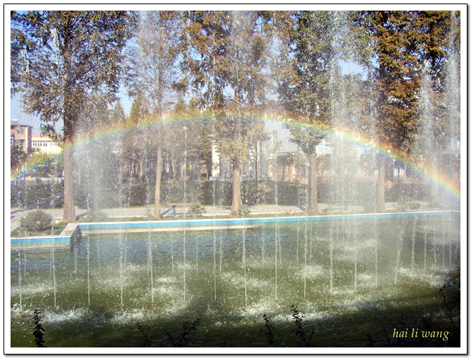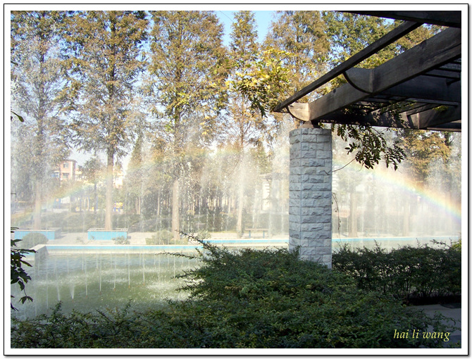 喷泉折映的,色彩不全.