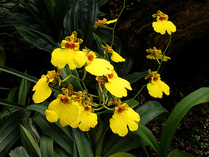 在洋兰家族中,舞女兰真令人感到妙处横生。它的花活象一个正在跳舞的姑娘,既有头、手、腰,还穿着一袭金黄色的长裙。每枝花约有五六十朵,多的达100多朵。恍如一群舞女正在伸开双臂,挥动长袖,在绿丛中翩翩起舞。细心赏来,真是有趣之至。