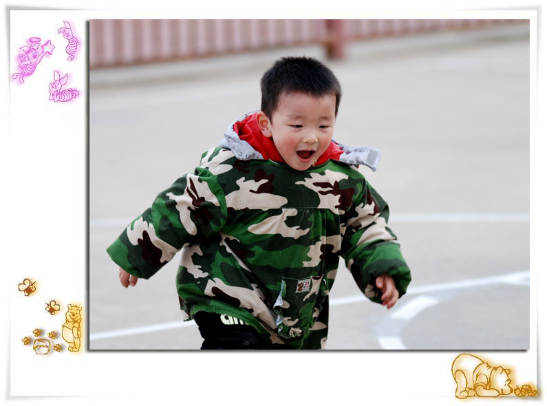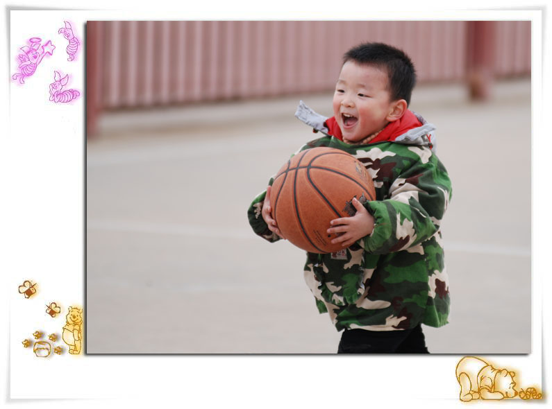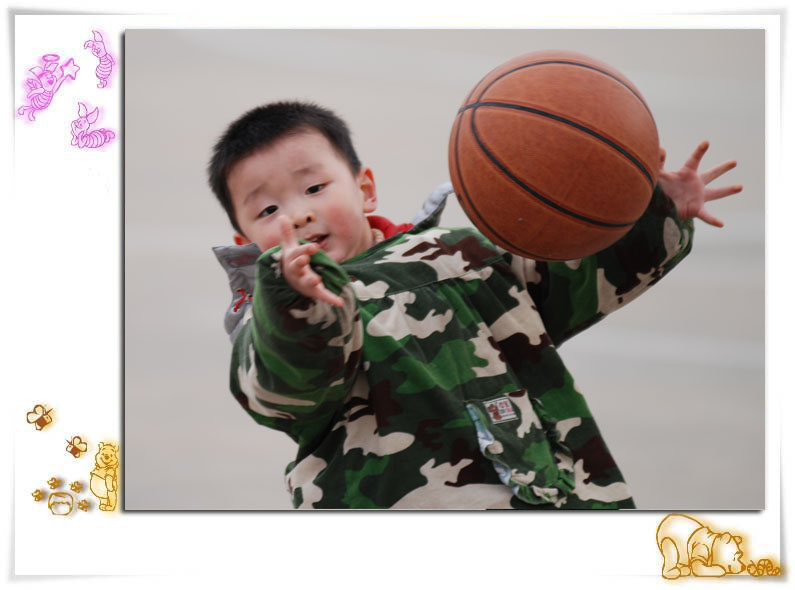 一位同事的小孩在爷爷的带领下,也与篮球展开了搏斗。
