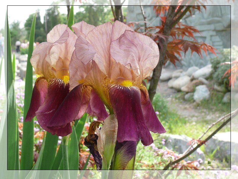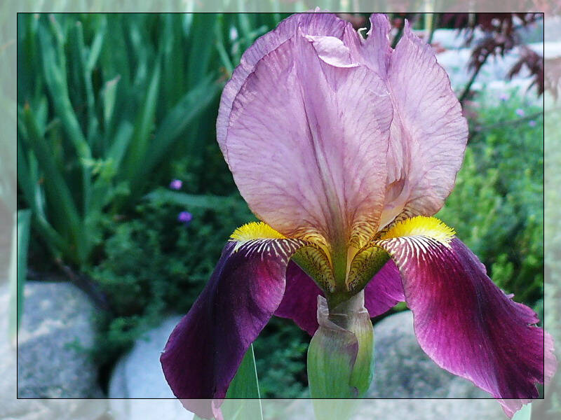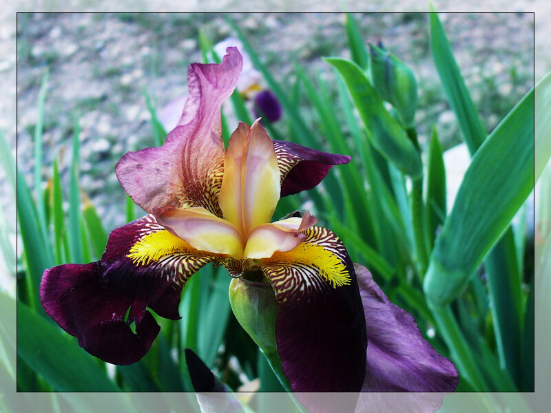 鸢尾,别名蓝蝴蝶、祝英台花。属鸢尾科,具根状茎的多年生花卉。高约80厘米。叶剑形,质薄,淡绿色。花梗着花数朵,花冠紫白色。外3枚较大,圆形下垂;内3枚较小,倒圆形。雄蕊与外轮花被对生;花柱3裂,扁平如花瓣状,覆盖着雄蕊。花在4一5月开放,花出叶丛,有蓝、紫、黄、白、淡红等色,花型大而美丽。朔果具6棱。