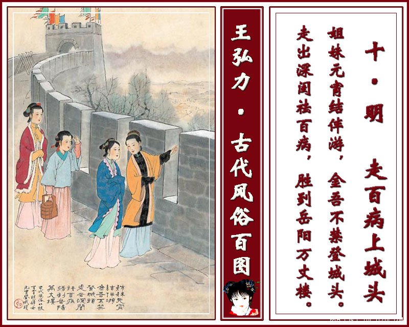 十 明 走百病上城头 姐妹元宵结伴游,金吾不禁登城头。走出深闺祛百病,胜到岳阳万丈楼。