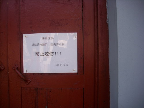 《防止咬伤》 拍摄地点:东二环内某胡同。院内养小狗,看来曾经咬过人。