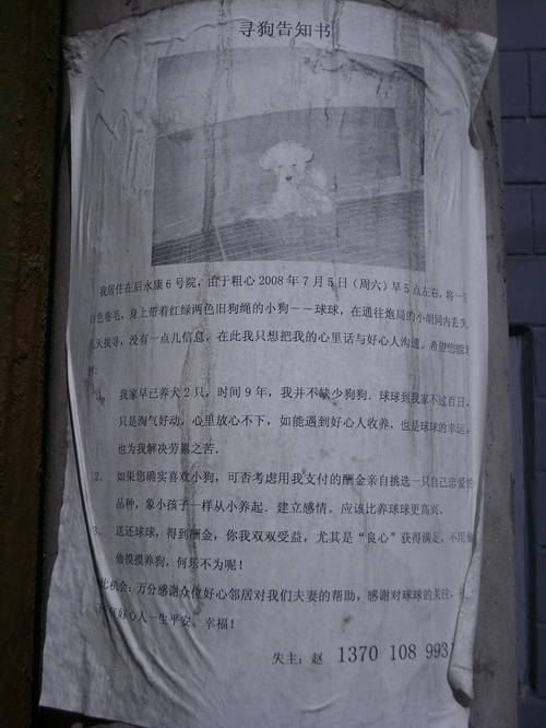 《寻鸟》 拍摄地点:东直门附近。在北京拍了很多寻物启事,本帖的第一张图是寻骡子,这张是寻鸟,北京人爱养鸟,养猫养狗也很多。下面我会陆续贴上寻猫寻狗的。大家可以看看寻物启事里面的北京。电话号码能看全的我都做了模糊处理。