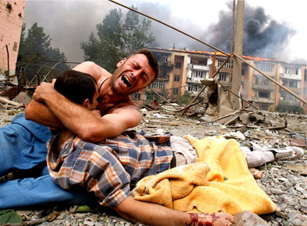 8月9日,俄罗斯对格鲁吉亚进行了轰炸。当天,至少5名格鲁吉亚人被俄空军炸死。图为空袭后,一格鲁吉亚男子紧抱亲属尸骨的场面。 (图片来源:路透社)