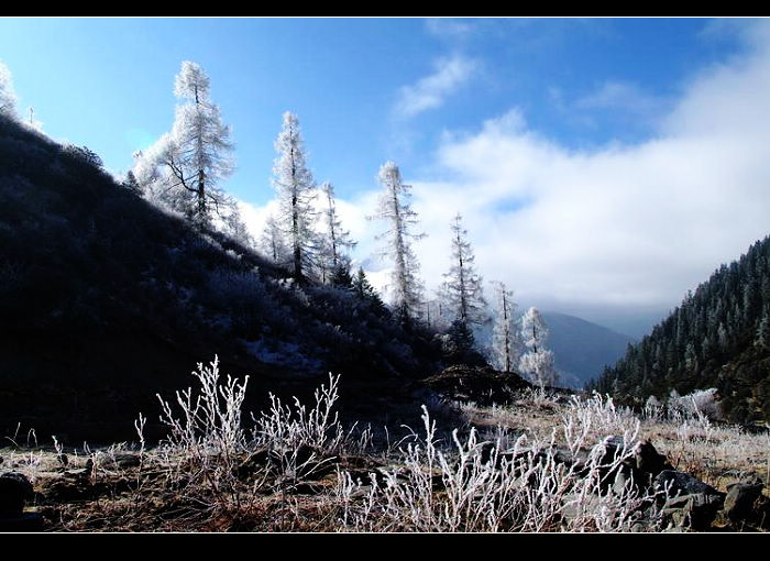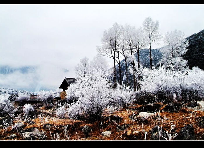 像一片秋天掉落的叶子,我四处飘荡,不经意之间闯入冬天的怀里。一夜大雪释放了蕴藏在川西大地中的所有激情,雪山上、森林里、小村旁无处不铺满了厚厚的冰雪。每到一处,眼前都会忽然一亮;每走一步,心灵都有一种强烈震撼的感觉。草木经过银白色雪花的勾勒,在黎明微微蓝色的印衬下,显得格外的美丽。穿梭在冰天雪地之中,似乎走进了梦中的童话世界,让人时时感觉惊喜不断……