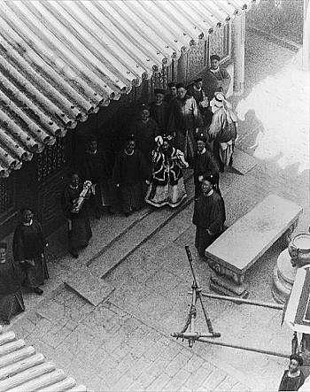 被太监环绕下的女皇(1908)。微笑的女皇,这是慈禧,击碎了太平军反叛的妇女,导致了义和团的兴起.