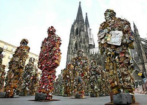 德国艺术家哈·舒尔特(HA Schult)能够充分利用自己手中的回收艺术品,将它们制造成“垃圾人”。在30位助手的帮助下,舒尔特将压扁的易拉罐,丢弃的计算机零件和其他物品收集起来,制造成令人毛骨悚然的垃圾人形象。目前,大约50个这样的垃圾人已在全球各地进行了巡回展出,比如:埃及金字塔和中国的长城。通过这些外形奇特的垃圾人造型,将让人们更多地反省人类的活动是怎样改变世界的。