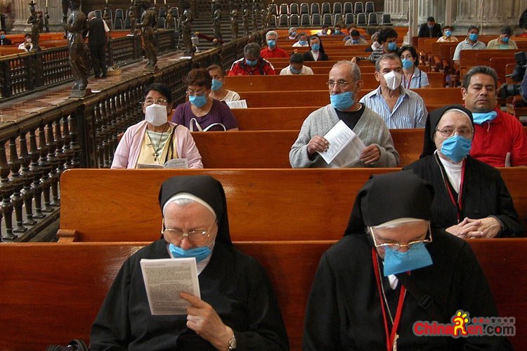 在墨西哥城的大教堂外,当地的宗教人士祈求“健康之神”赐给他们健康,结束猪流感。这项活动上次举行是在1691年墨西哥城爆发天花时。