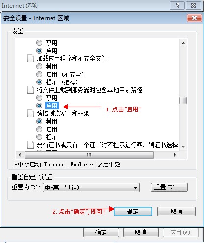 你也可以用“自定义安全设置”的方法选中下图中的复选取框,主要安装完Internet Explorer 8 Beta1 或IE7后把被更改的浏览器安全设置中的"将文件上传到服务器时包含本地目录路径"下面这一项为“启用”.