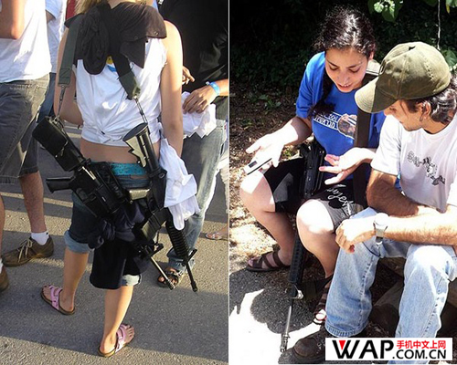 问过不少人,有的人说是因为以色列是全民皆兵,所以人人带枪,也有人说那是军人穿了便装......,我虽然没有什么兵器知识,但枪战片还是看过不少,起码看得出她们身跨的不是一般老百姓的防身武器,连小孩都知道那是正规军的装备,何况逛街购物身后背着这种长枪也肯定很不方便......