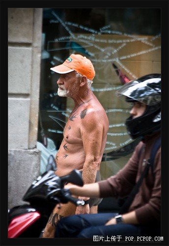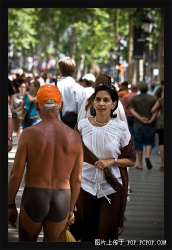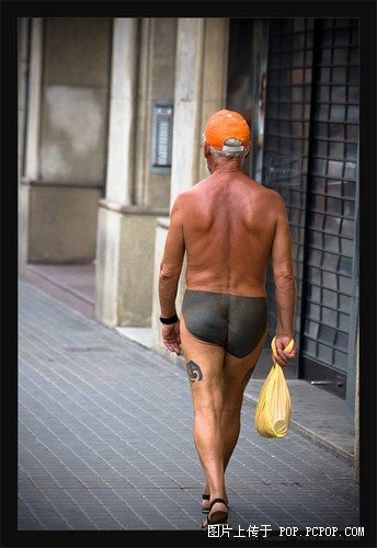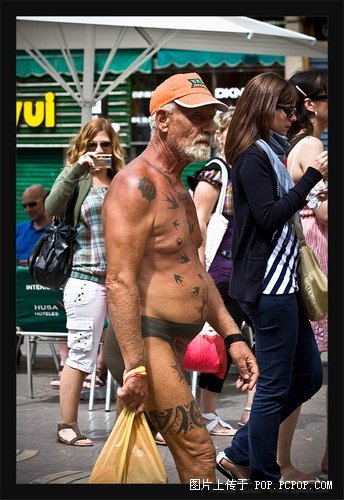 传说在遥远的巴塞罗那有这么一位大爷,他上街从来不穿衣服,当然也不穿裤子。为了不至于看起来太突兀,大爷为自己画了条内.裤.。他是巴塞罗那的传说,没人知道他的名字他的来历,但是有很多人拍到了他的照片。