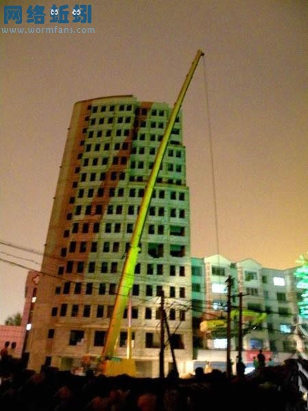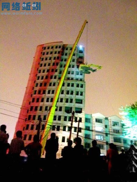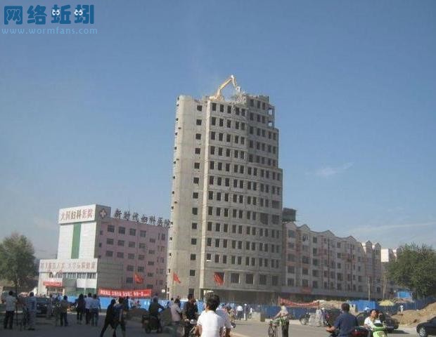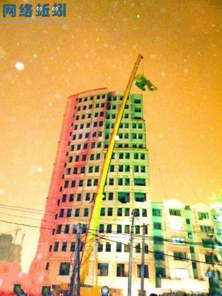 这么高的楼,拆起来肯定比较有难度,最简单的方式就是爆破。估计成本比较高,开发商可能负担不起,于是请来了一辆大吊车。
