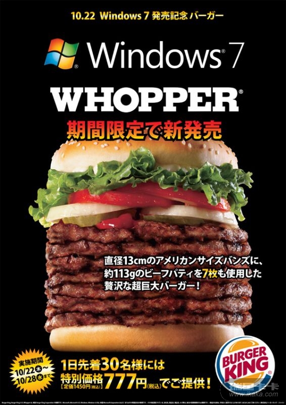 日本的 Windows 7 华堡有合乎时宜的 7 片肉,定价 1450 日元一个,但如果你是一日的前 30 位购买者,恭喜你!只要777 日元就要撑到你死。活动期间 10/22 ~ 10/28 共 7 天,让大家一起用 7 来庆祝