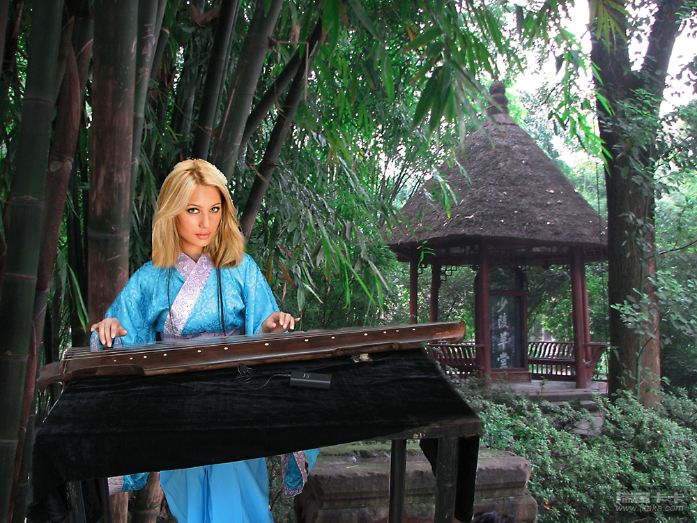 成都的杜甫草堂世人皆知,这是我合成的希腊小姐弹古琴的PS照片