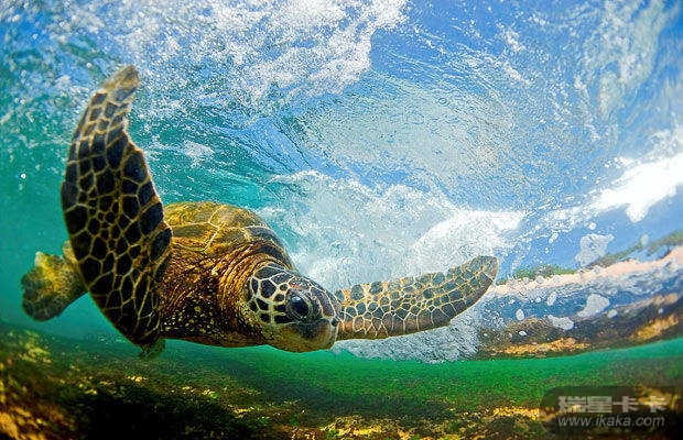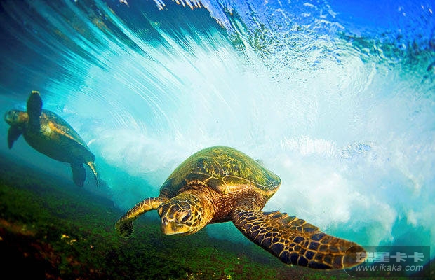 图为海龟前往夏威夷海滩及返回途中钻入水中,穿过碎浪。