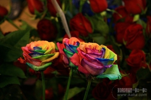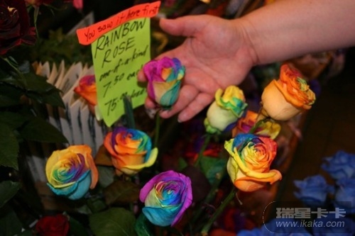 彩虹玫瑰,一朵花上的每个花瓣都颜色不同,但却绝非纸花或者塑料花,而是货真价值的有着水分的新鲜花朵。具体实现原理是在花茎不同部分注射不同颜色和剂量的鲜花染色剂控制每个花瓣的颜色,最终呈现出绚丽的彩虹花瓣。原理很简单,听起来你也许会觉得这就跟在屁股上打针一样,不过这可是很有技术含量的。这种最早由荷兰的一名花匠发明的染色技术,使得鲜花市场上异彩纷呈。