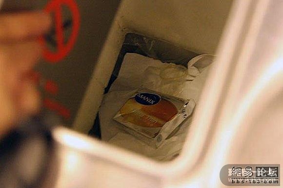我打开垃圾桶的盖子,那个被盖子夹住的不名物体也掉了下去,往里一看,果然没错,是一个安全套!里面还有包装盒!难道是一男一女刚上演过一场高危动作大戏?不会这么大胆吧?这应该只有在电影里才能出现的情节啊,第一次用飞机的厕所就遇到了如此BT的一幕。唉,这次乘机经历真是让我心神不宁啊~~~