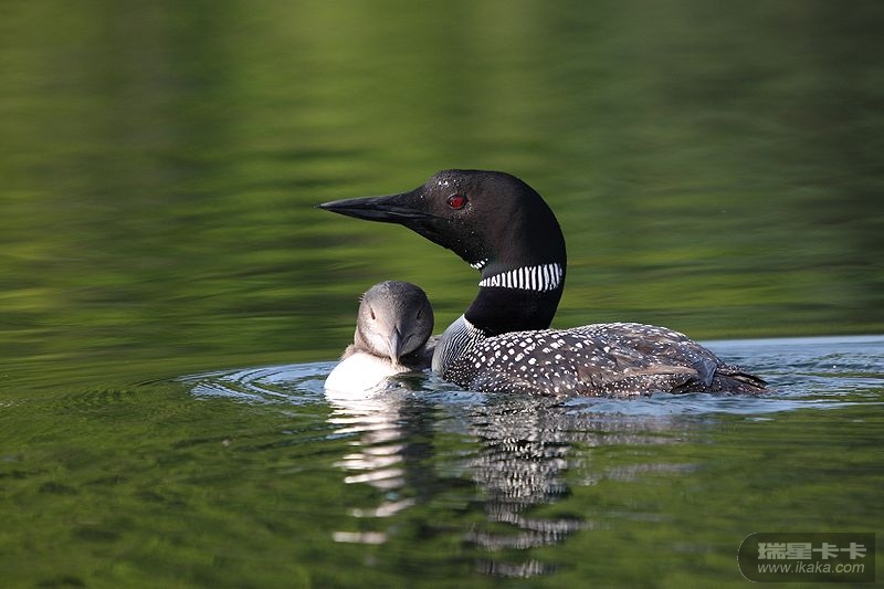 普通潛鳥是廣泛分布在北美洲的一種潛鳥,被鑄造在加拿大一元硬幣上,以及20加元紙幣的背面。成年普通潛鳥的體長在61-100厘米,翼寬122-152厘米,只比白嘴潛鳥稍微小一點。體重為1.6-8千克,平均為4千克左右。繁殖期的普通潛鳥分布於加拿大、美國北部、阿拉斯加和格陵蘭,在冰島也有一小部分普通潛鳥。普通潛鳥每次產1-3卵,雄鳥和雌鳥都參與孵化。圖為普通潛鳥的成鳥和幼鳥,拍攝於加拿大魁北克省藍海湖。