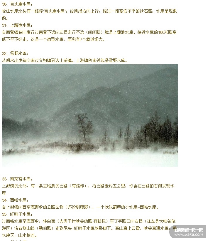 距济南约60公里。路线: 走仲宫柳埠上长城岭, 到黄前水库东拐到上港再到小岸门。
