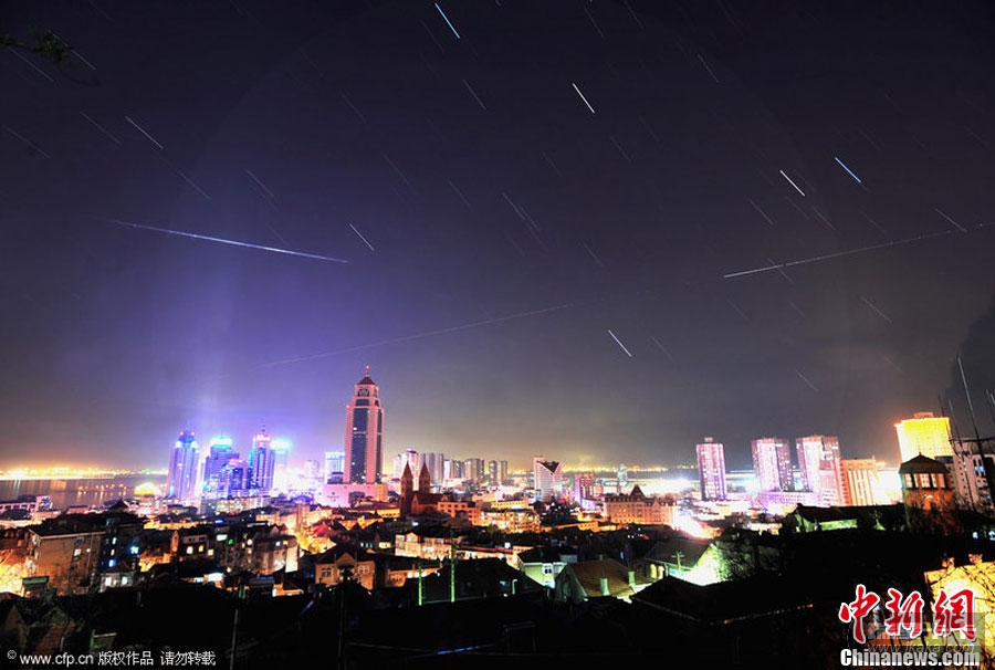 临近岁末,双子座流星雨如期而至。12月14日19时,双子座流星雨达到极大,每小时流星量达120颗。图为山东青岛栈桥景区上空明亮的流星从双子星座辐射而出,划过城市上空。