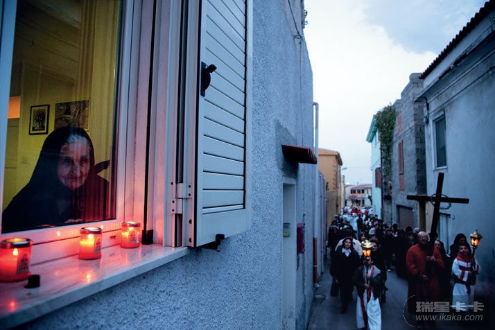 撒丁岛Orosei,一位老太太从前窗观看经过她家的耶稣受难日纪念游行队伍。在老年化国家,撒丁岛的人口尤其老,那里的百岁老人所占比率为世界最高。最近,岛上百岁以上老人人数达到187人。