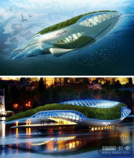 设计师文森特·卡雷巴特(Vincent Callebaut)创作了一个鲸鱼形状的“漂浮之城”——“僧帽”(Physalia),旨在令其漂流于世界各地的河流之上,从而消除污染,净化河水。这是一个自给自足的生态系统,可借助自身的“光合作用”获得所需的能源,并通过生物过滤减少水污染。这座“城市”里面到处是花园,表面覆盖着绿顶以及超薄太阳能电池板。