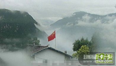 鲜艳的五星红旗在悬崖上,在云海中高高飘扬