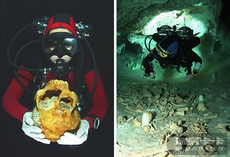 在这个名为Tux kapaxa cave的墨西哥水下洞穴中,考古学家发现了人类生活的遗迹以及大量动物的遗骸。左图是一名潜水员手捧着在墨西哥某水下洞穴中发现的骷髅头。右图是一名潜水员游过一堆人类的骸骨