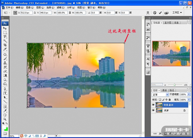 第二步,复制图层后,点ctrl+t,就激活了这图,可见图片四周出现了调整框