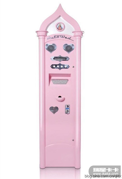 结婚自动贩卖机。只要投入1英镑,输入双方名字,就会给你一张结婚证书跟一对结婚戒指。