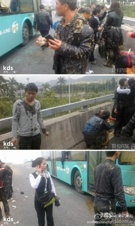 某地一公交车追尾了拉粪车,公交前档破了,大粪们直接破档涌入车内
