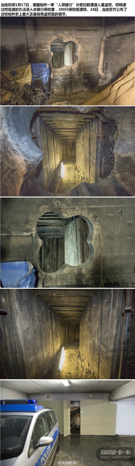 德国柏林一家银行日前失窃。窃贼通过挖地道的办法进入该银行保险室,偷走超过1亿欧元的财物。窃贼在银行附近的地下车库中,耗时一年左右挖了一条隧道,直接通向银行保险室,顶端以及四周用板材固定,丝毫没有偏离方向。网友看到如此规整的地道不禁惊呼,实在是史上最严谨窃贼!