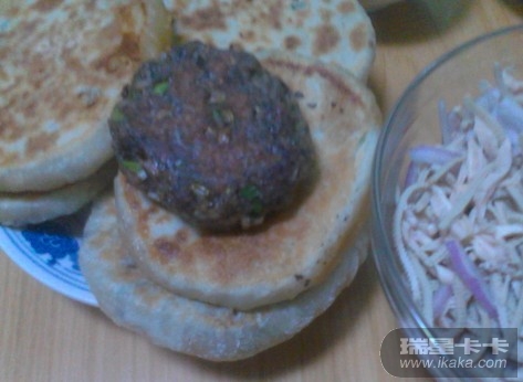 老妈用马蹄儿、菜、肉和紫米面给小二做的小肉饼子儿