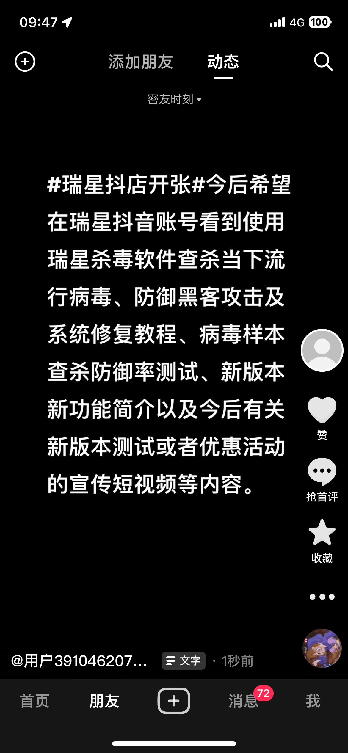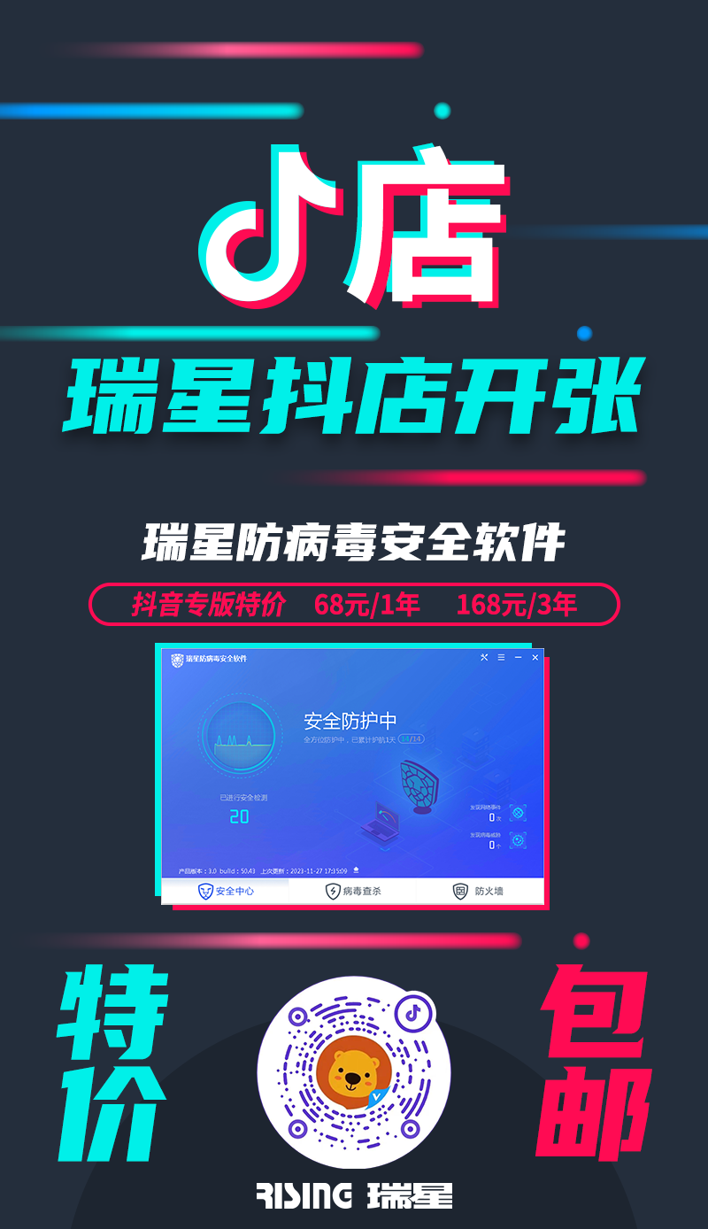 为庆祝瑞星抖店开张,特推出瑞星防病毒安全软件抖音专版(68元/年,168元/3年),并举办有奖活动征集建议,奖品多多,欢迎参与!