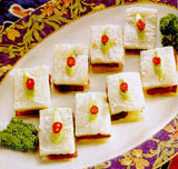 将米磨粉制糕的方法也很早。这一点可从北魏贾思勰的《齐民要术》中得到证明。其制作方法是,将糯米粉用绢罗筛过后,加水、蜜和成硬一点的面团,将枣和栗子等贴在粉团上,用箬叶裹起蒸熟即成。这种糯米糕点颇具中原特色。