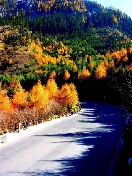 秋天是美丽的,秋天大山里的路在红叶的映衬下--------.