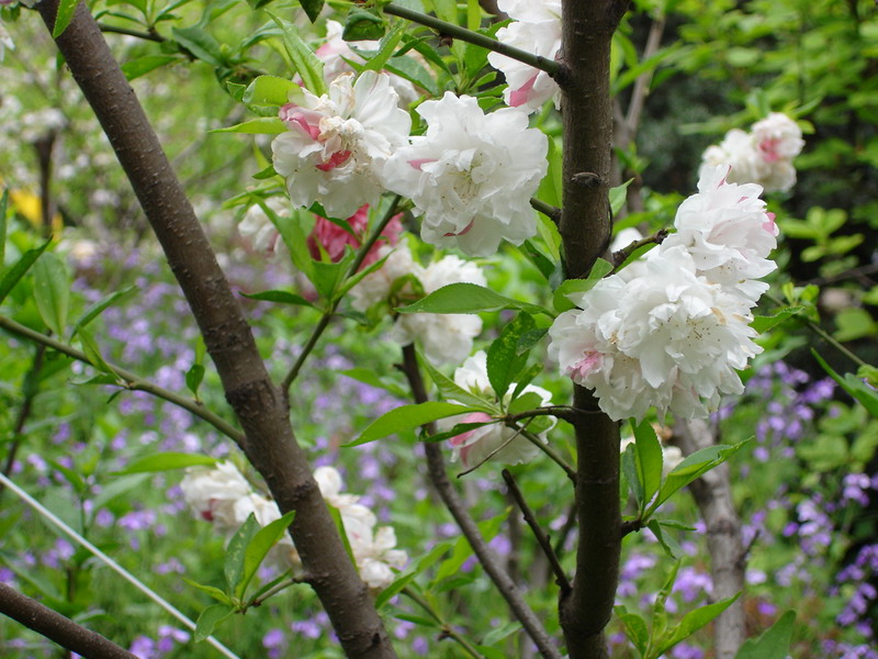 1图桃花后面星星点点的蓝,不知道是什么花,看上去也很美...