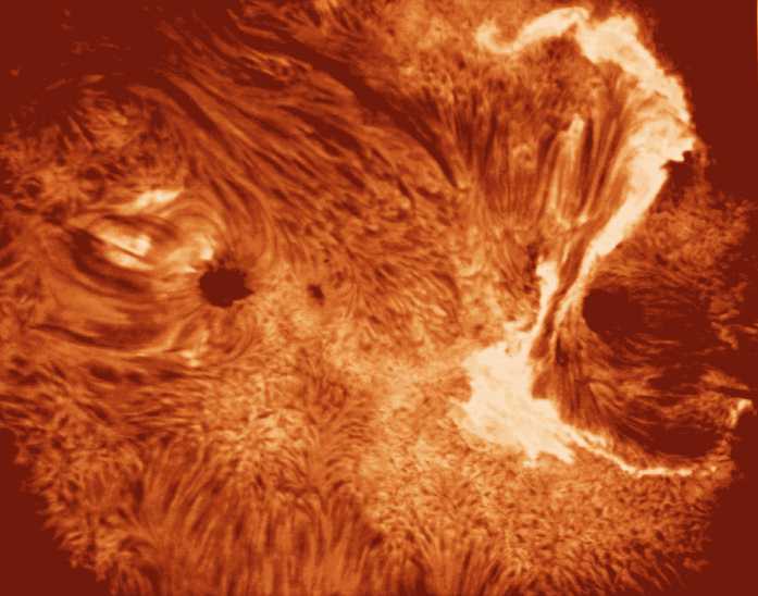 这张太阳的圆面照片摄于H-alpha波段。H-alpha波段是一个狭窄的红色光波段。