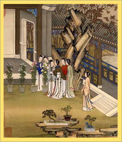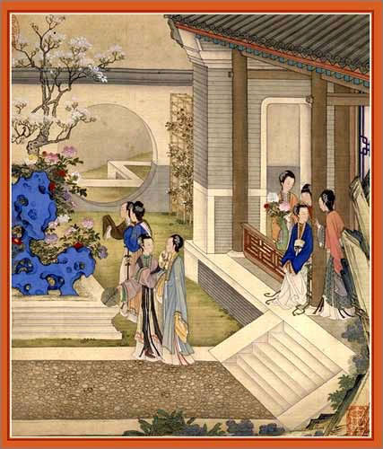 二月 寒夜寻梅 正月里,上元之夜,华灯溢彩,银月似盘,梅花绽放,宫中贵妇们结伴游赏。