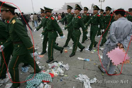 军队走的时候这位拿塑料垫的男公民能站在这个位置?!!